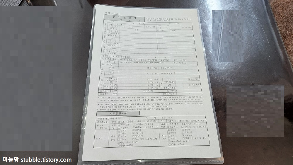 혼인신고를 언제 할까 하다가 결혼기념일 1주년에 하는것이 괜찮겠다 싶어서 2달 전에 친정집 앞 면사무소에 가서 혼인신고서 양식만 몇 장 가져왔어요.