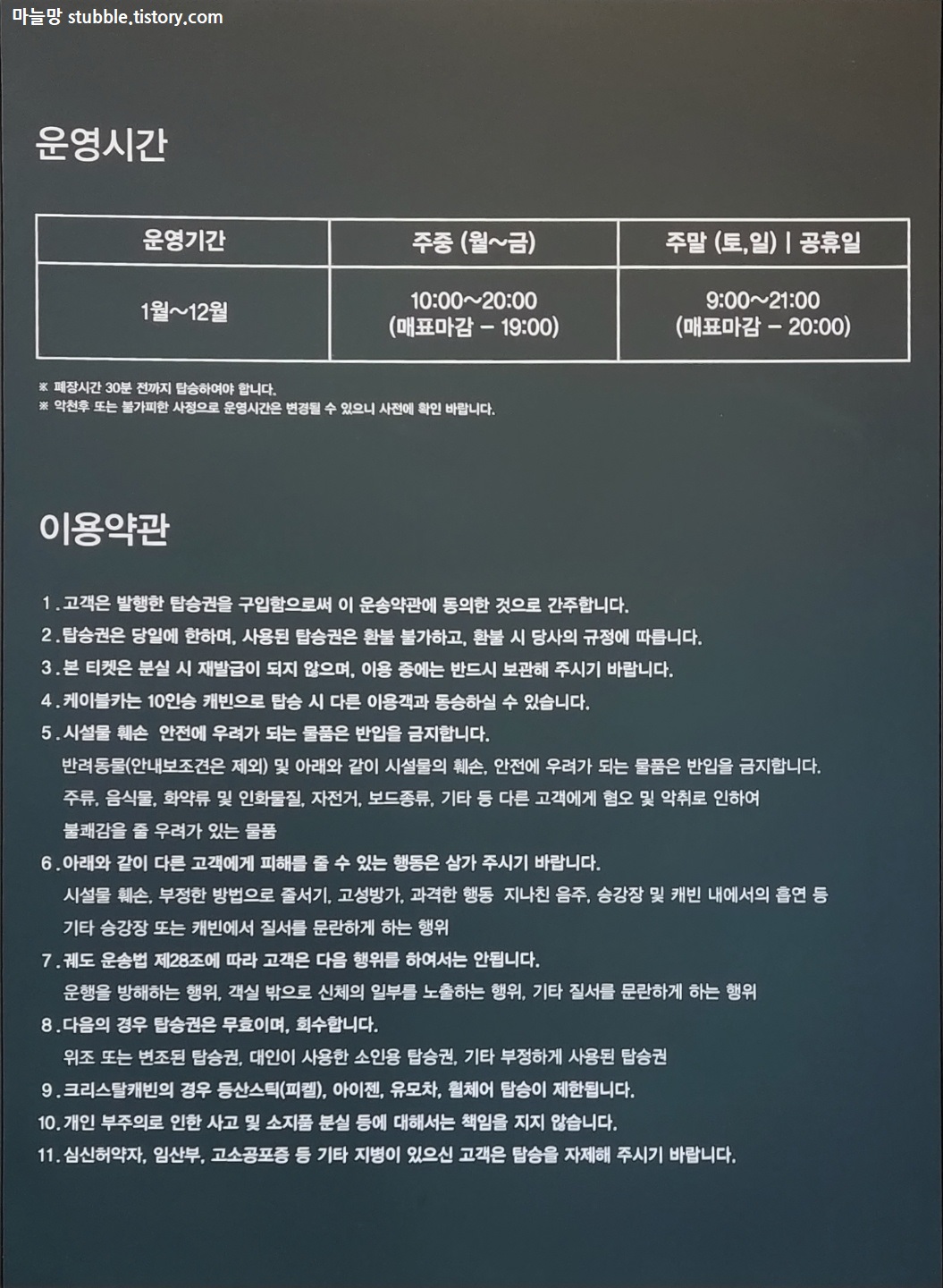 우리는, 다시 건물로 돌아와서 운영시간과, 요금 안내판을 찍고는 다시 탑승장으로 올라갑니다.