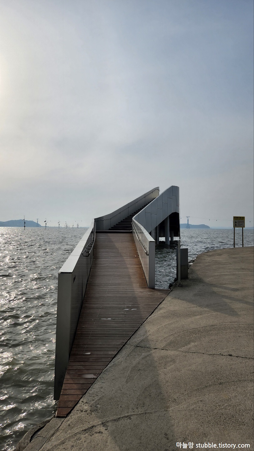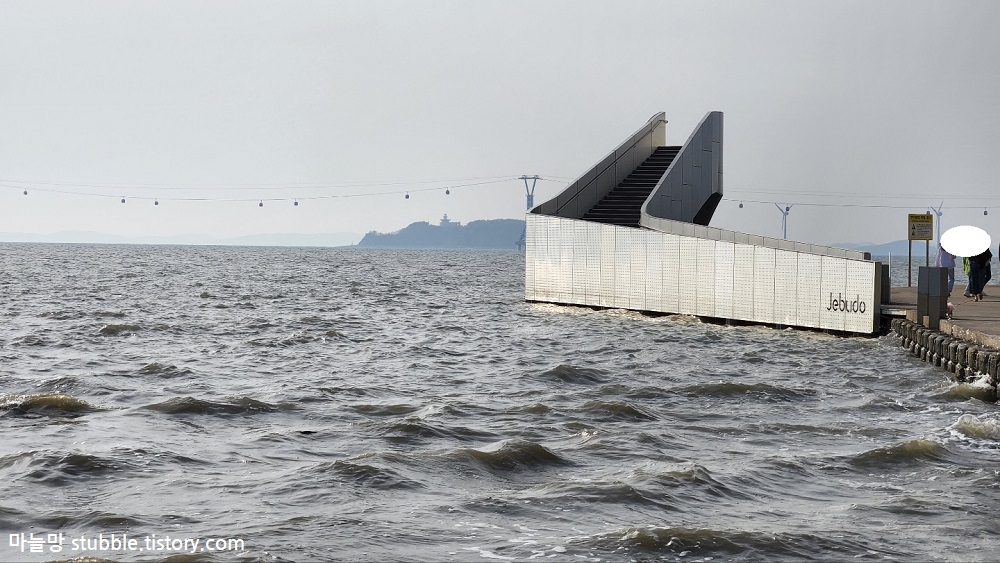 워터워크 정상에 올라 반댓쪽 사진을 한방 찍었습니다. 워터워크 정상까지 오르면, 반댓쪽에는 이렇게 내려가는 계단이 있고, 삼각존이 있습니다. 뒤가 유리로 되어 있어서 사진을 찍으면 제부도의 멋진 풍경을 담을 수 있어요. 특히 여기에서는 전곡항과 제부도를 오가는 서해랑 케이블카가 오가는 모습을 볼 수 있고, 그 뒤에는 탄도항 풍력발전기 3대도 함께 볼 수 있어요.
