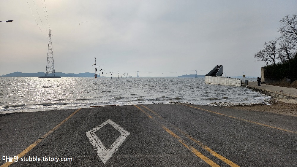 이 사진은 도로의 중앙선이 살짝 보여서 바닷길이 잠겨 있는것이 더욱더 현실감 있게 느껴집니다.