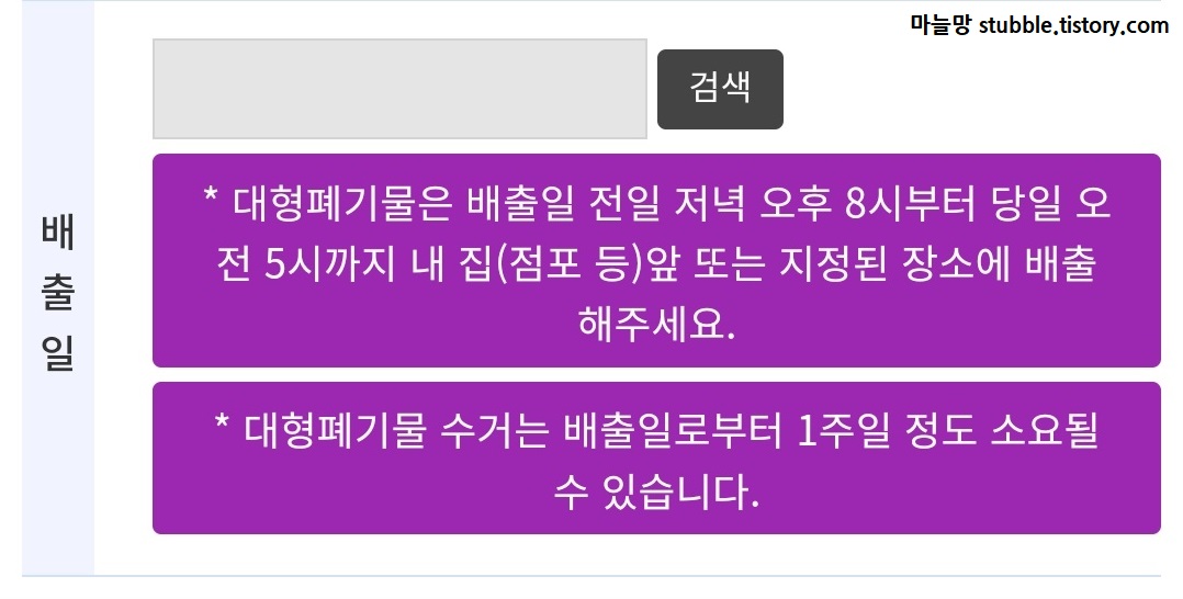 배출일은 내가 신청한 날짜의 전일 저녁 오후 8시부터 당일 오전 5시까지 쓰레기를 버리고자 하는 주소지의 쓰레기 버리는 곳에 스티커를 붙여 놓으면 가져간다고 합니다.