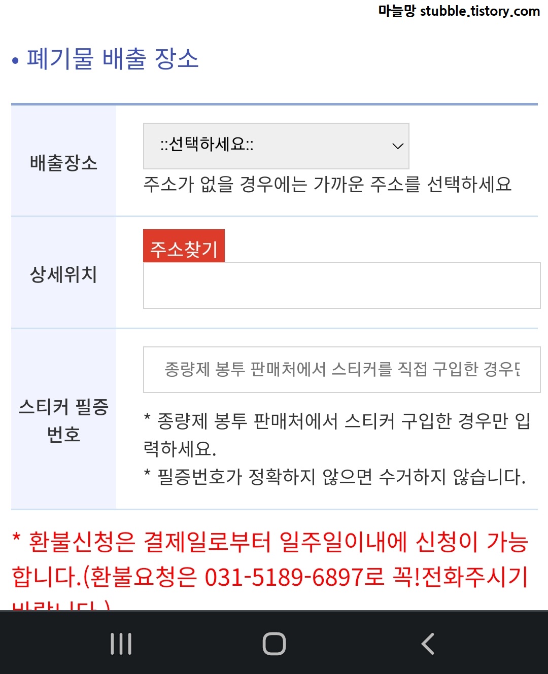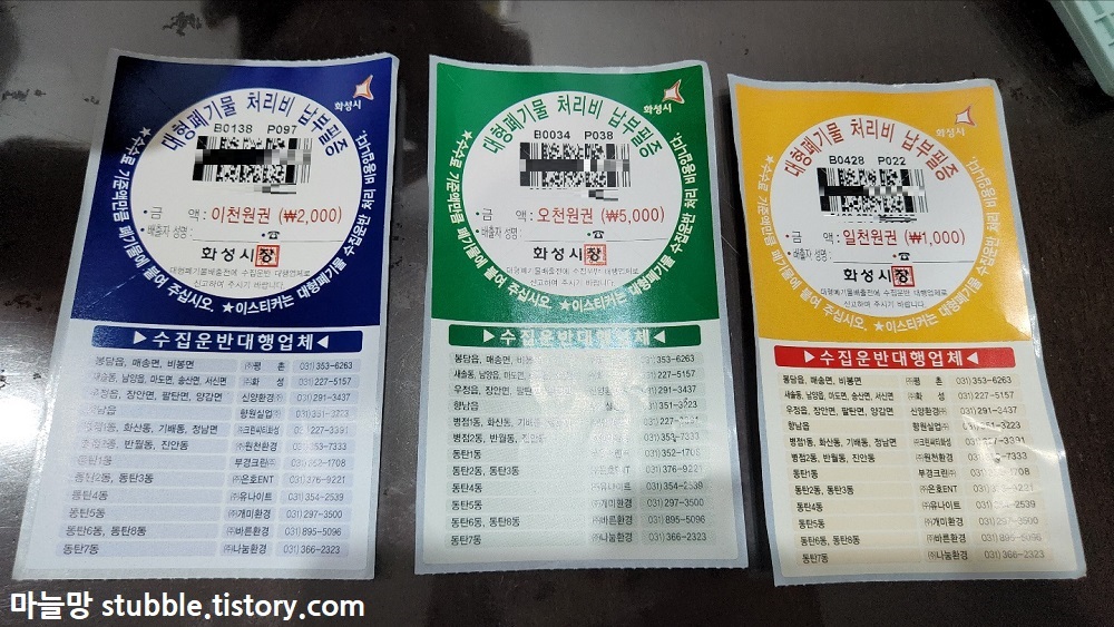 주변 쓰레기봉투를 취급하는 마트에 전화해보니, 폐기물 스티커도 판매한다고 하여 스티커를 금액에 맞게 사 왔습니다.