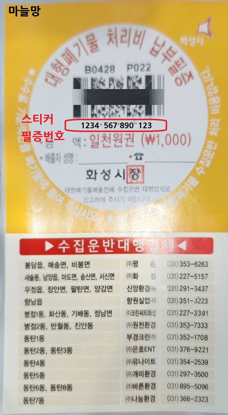 화성시 대형 폐기물 처리비 납부필증의 스티커 필증 번호는 바코드 아래의 숫자입니다.