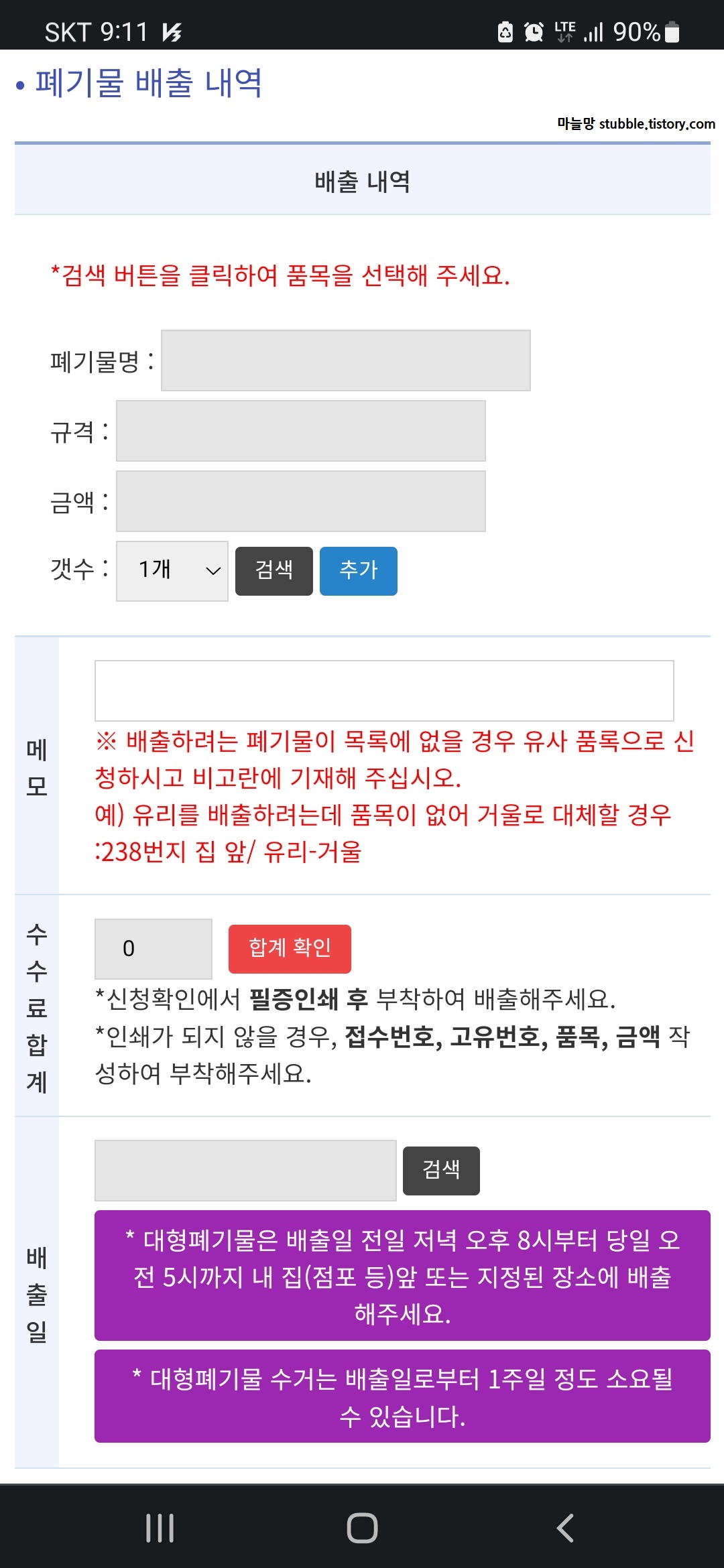 대형 쓰레기를 가지고 가는 날짜(신청한 날짜)의 전일이 되었어요.