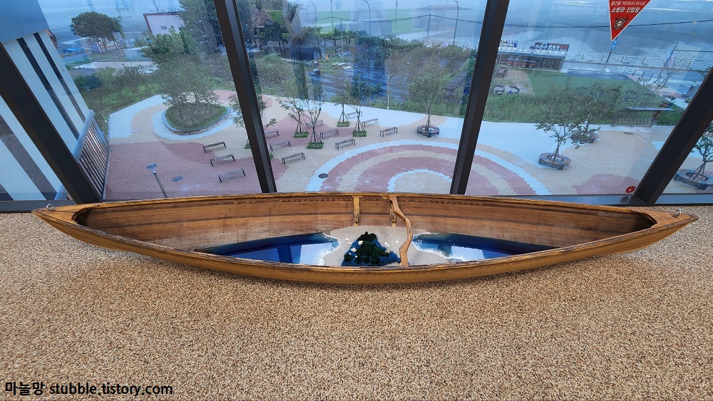 우리는 3층을 둘러보다가 배 모형을 발견하게 됩니다. 바깥 풍경과 나름 잘 어울리는 것 같죠?!