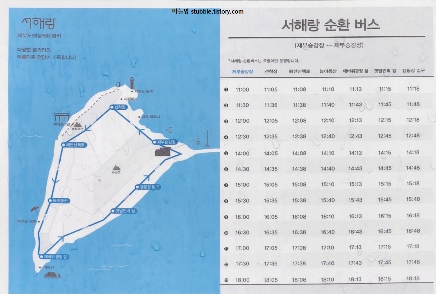 전곡항에서 케이블카를 타고 제부도에 넘어오면, 차도 전곡항에 있고, 제부도 케이블카 승강장 주변에는 놀거리나 재미있는 것이 없어서 거의 대부분은 제부도 서해랑 건물에만 남아있다가 다시 전곡항으로 케이블카를 타고 돌아가게 되는데요. 만약 시간이 되어 평일에 케이블카를 타고 이곳에 온다면, 건물 밖에 나와서 순환버스를 타고 제부도 해안가를 따라서 한 바퀴 돌아보는 것도 괜찮은 일정인 것 같아요. 위에 나와 있듯이 케이블카 탑승권을 가지고 있으면 무료이므로 부담도 되지 않겠죠.