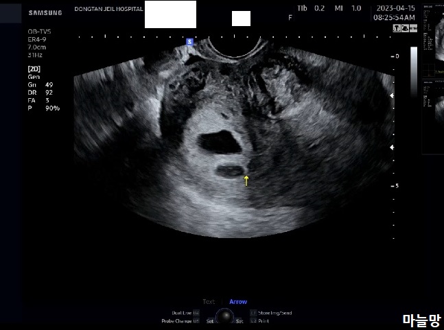 그리고 보인 초음파 화면의 아기집은 붉은 피 출혈에도 쓸려 내려가지 않고 자리를 지키고 있었습니다.