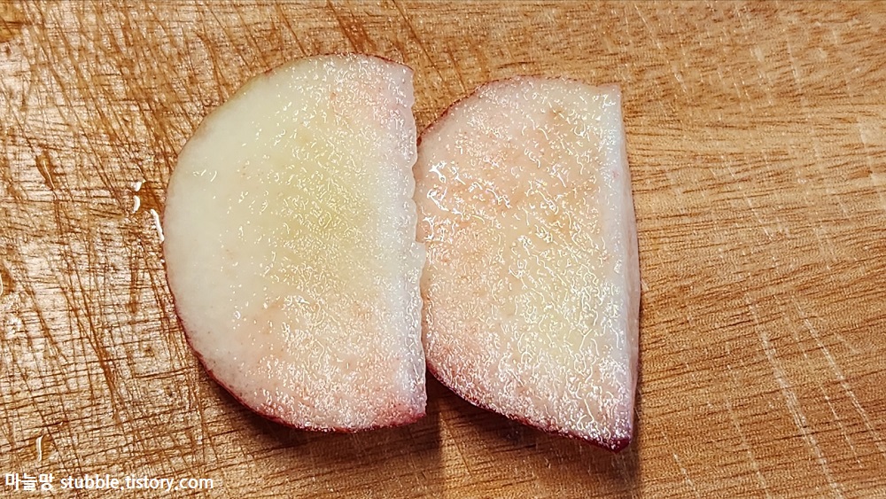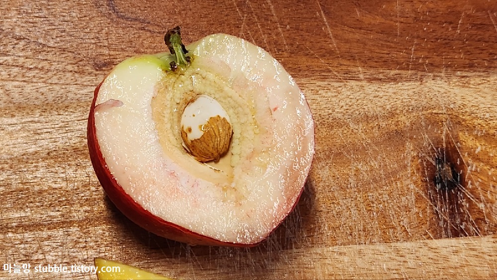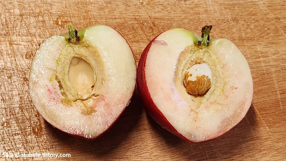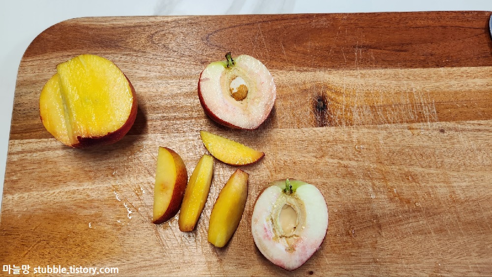 천도복숭아와 신비복숭아를 잘라 봤어요. 뭔가 천도복숭아는 노란색이 강하고 신비복숭아는 흰색이 강합니다. 신비복숭아는 속이 백도처럼 생겼어요. 붉게 보이는 부분도 보이고요.