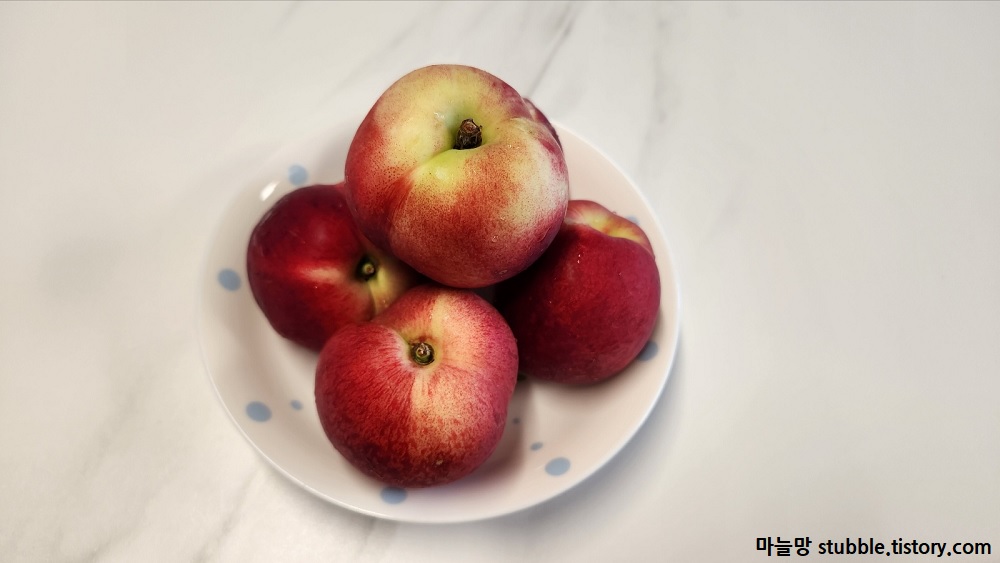 일부러 비슷하게 생긴넘들로 골랐어요. 크기차이가 있는데 신비복숭아는 중간사이즈이고 천도복숭아는 마트에서 팔고 있는 일반적인 크기예요. 이렇게 보니 껍질색깔에서 차이가 나는 것도 같아요. 천도복숭아가 살짝 더 노란색을 띱니다. 신비복숭아는 조금 희고요.