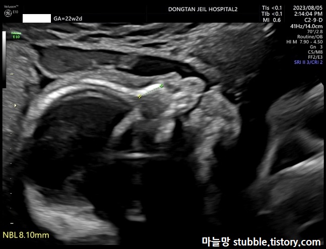 코뼈의 유무에 대해서는 12주 초음파에서도 봤었지만 이번에는 꽤 많이 성장한 코뼈를 볼 수 있었어요.