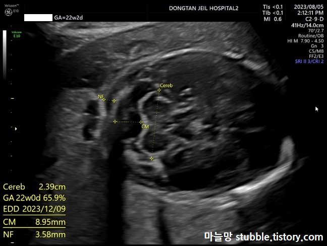 아기 머리 직경을 재고 있어요. 22주 2일에 5.36cm 이예요. 머리 직경은 크지도 작지도 않고 주수대로 잘 자라고 있는 듯 보입니다.