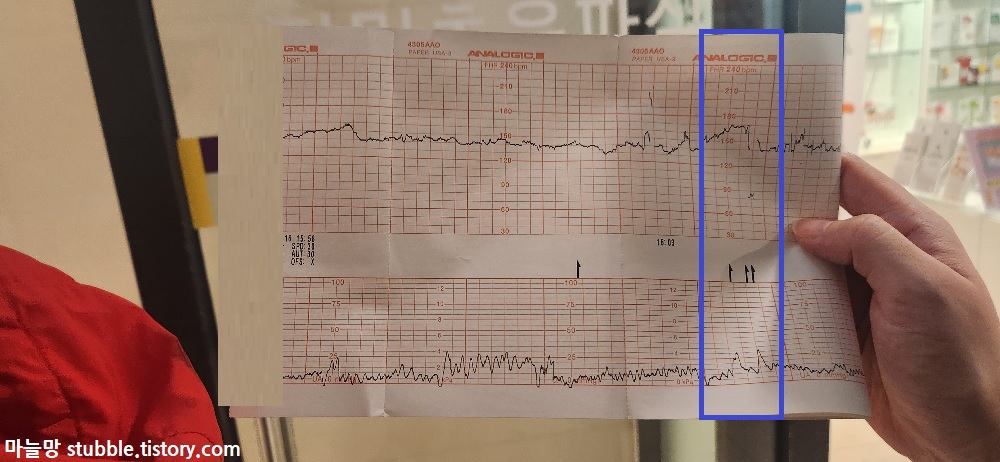 태동이 올 때마다 리모콘을 누르며, 옆에 기계에서 그래프 지나가는것을 유심히 봤어요.