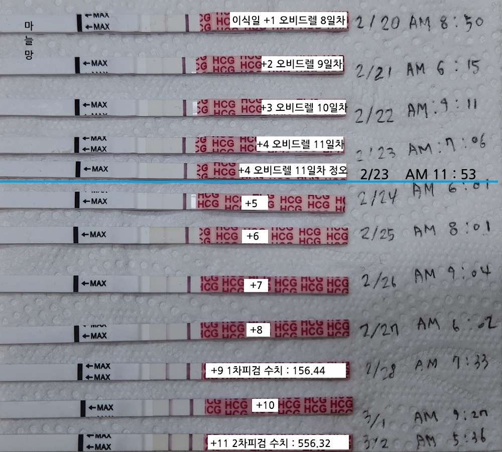 이식일은 오비드렐의 효과가 나름 진합니다. 그 후에 점차 연해져서 이식 4일차 오후에는 거의 안 보이게 됩니다. 참고로 저는 오전보다 오후가 임테기가 진한 사람입니다. 그런데 4일 차 오후를 보면 거의 안보일정도로 연해집니다. 오비드렐의 효과가 거의 빠진 듯 보입니다.