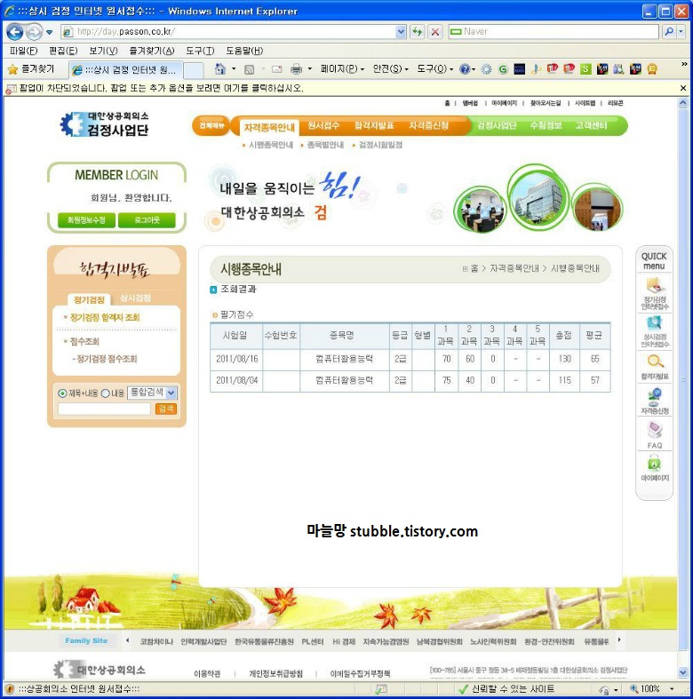2011년 7월 28일 상설검정으로 컴퓨터 활용능력 필기 2급을 접수합니다.