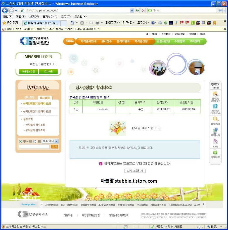 | 컴퓨터활용능력2급 실기 드디어 합격!! 합격과정, 합격하는법, 합격요령 (0) | 2011.10.14 |
