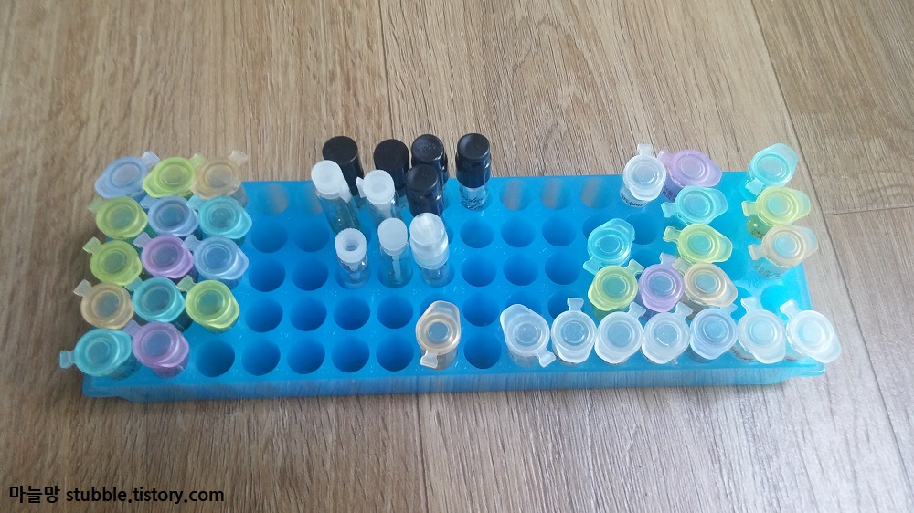 향수가 들어있는 캡튜브들과 홀에 들어가는 일부 향수 앰플들을 마이크로 튜브 랙에 가지런히 정리해봤어요.