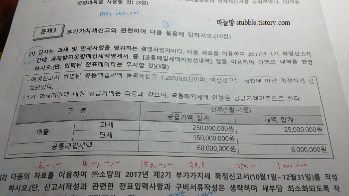 문제3 부가세 구역 문제는, 3-1번문제 보자마자 으악! 불길한 예감은 맞는다더니...결국 나왔어! 라고 생각했어요. 과세&면세 겸영사업자의 공통매입세액의 정산내역 문제였죠. 이런 문제 입력이 헷갈려서 제 교재에 아직도 포스트잍 잔뜩 붙어있거든요. 시간 나면 다시 보려고 했던거죠. 이건 답이 너무 궁금하여 시험 보고나서 제가 적은 순서대로 답을 적어왔었어요. 막 급하게 적어서 저 빼고 알아보는 사람은 잘 없겠지만 결과는 정답! 3점 득점!