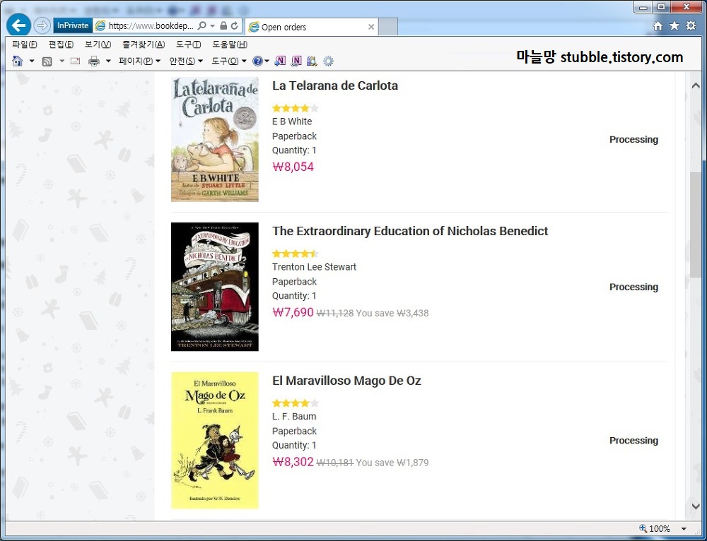 영어원서들을 간혹 조금씩 읽고 사모으는 취미가 있다보니 영어원서 구입처에 대해서도 관심이 많던 저는 북디파지토리라는 영국 인터넷 서점을 알게 된지는 꽤 된 것 같습니다. 하지만 영어원서라면 보통 청소년소설이나 어린이 챕터북, 또는 뉴베리상 받은 책들, 판타지 도서를 좋아하다보니 우리나라에서도 충분히 저렴한 값에(세일할때 골라사서) 구할 수 있었기에 그동안 이용해본적은 한번도 없었는데, 오늘 드디어 카드결제를 해보는 기회를 갖게 되었습니다.
