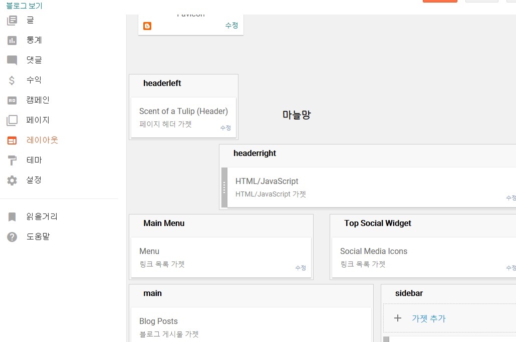 레이아웃에는 현재 저의 구글블로그의 구조가 이렇게 나열되어 있었는데요. 그중에서 상단바에 해당하는 Main Menu(메인메뉴)에서 「수정」을 열어봅니다.