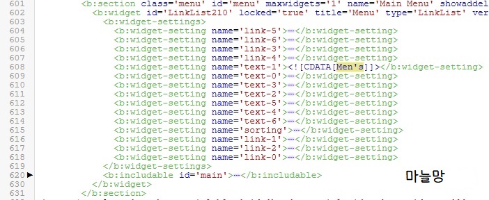 으잉? 이건 내가 원하던 형태가 아니잖아! li 태그가 존재해야 할 곳에 <b:widget-setting name='link-0'>...</b:widget-setting> 이런것들이 나열되어 있었습니다. 이건 뭐지? HTML 태그 초보자인 저는 고민끝에 주소가 가려져 있는 ...부분을 다 펼친 후에 링크-번호랑 텍스트-번호 랑 맞춰놓고 나머지는 싹 다 지웁니다. 그리고 테마저장!