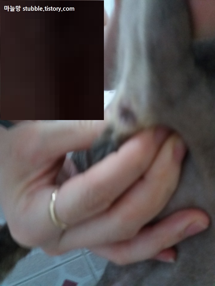 뭔가 징그러운 색깔이지만 (색깔보다 냄새가 더!! 더!! 더!!!) 이것으로 항문낭 짜기에 성공했습니다.