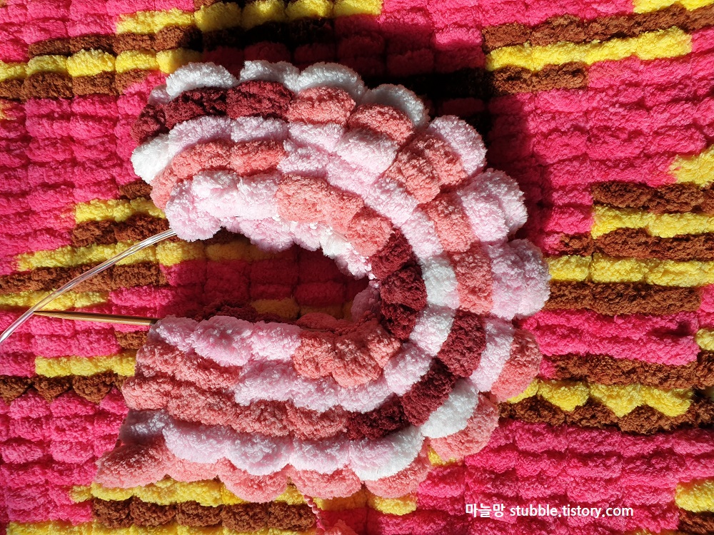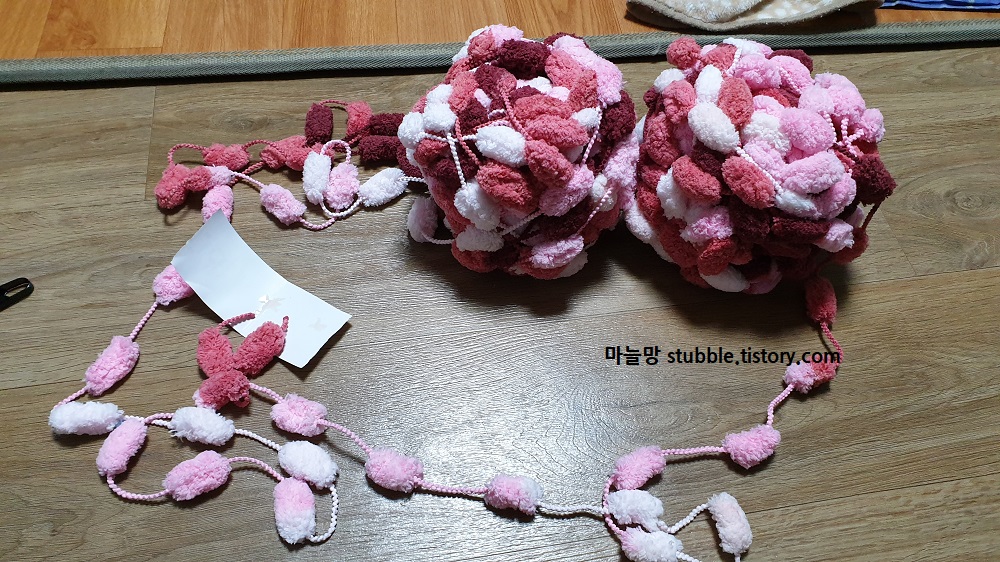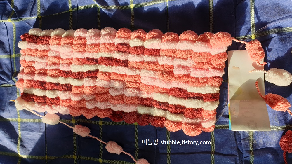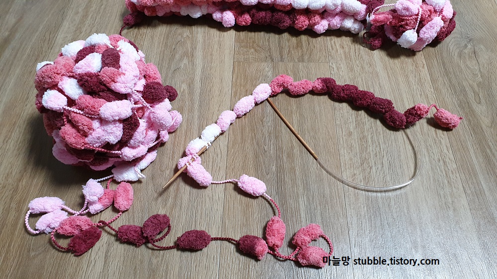 ▲ 기존에 폼폼실 2볼을 모두 사용하고도 실이 모자라서 역시 주문했던 세번째 볼로 열심히 떠내려가는 중입니다.