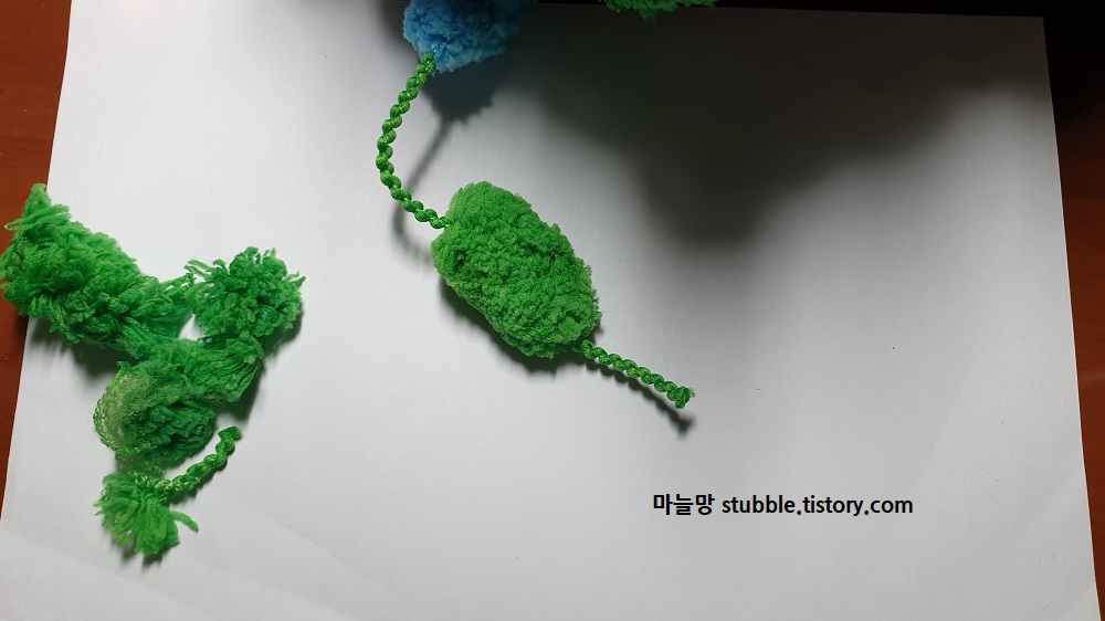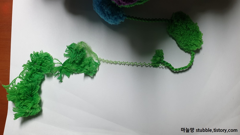 폼폼실을 가위로 자른 부분을 불로 태워주거나 매니큐어를 발라주지 않으면 사진처럼 끊임없이 풀려나갈 수 있습니다.