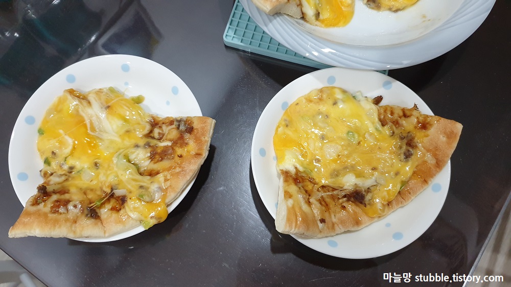 그리고 먹을 사람들이 치즈귀신들이라서 타사 피자치즈를 더 뿌렸습니다.