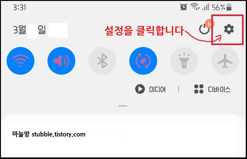 갤럭시 슬라이드 빠른설정창에서 톱니바퀴 모양을 클릭하면, 설정 화면이 뜨게 됩니다.