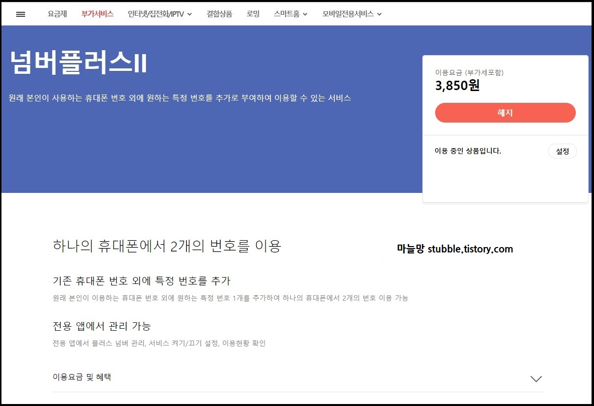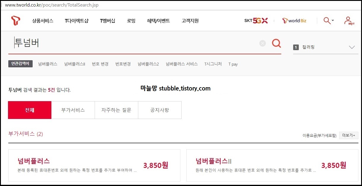 결국, 주인장은 사용하고 있는 핸드폰의 현재 통신사 SKT의 투넘버 서비스인 「넘버플러스Ⅱ」(유료)를 이용하여 번호를 하나 더 만들게 됩니다.