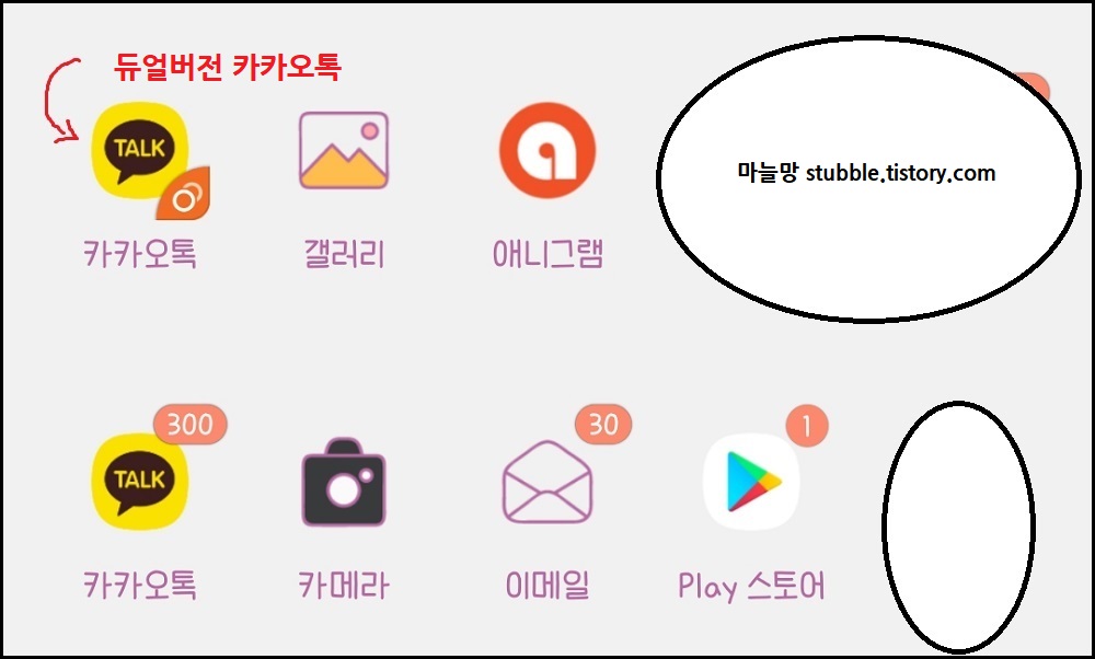 그러면 휴대폰의 앱 서랍 속에 듀얼 카톡모양 앱이 보일 것이고, 클릭하여 두 번째 핸드폰 번호로 두번째 카톡 계정을 만들어 나가면 됩니다.