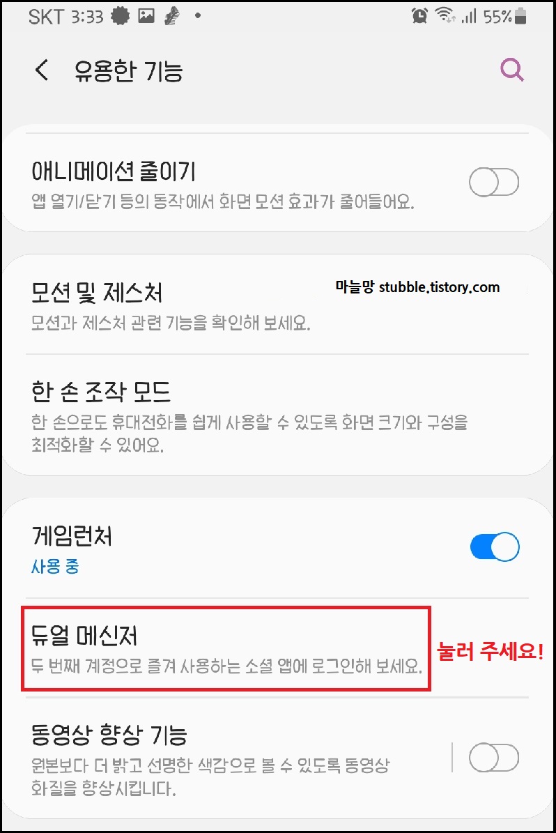 「유용한 기능」 안에 들어와서는 「듀얼 메신저」를 찾으면 되고요.