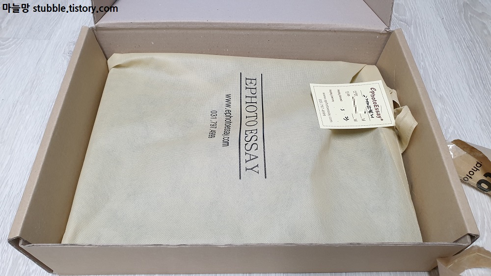 상자를 여니, 「이포토에세이」라는 로고가 새겨진 어두운 상아색의 더스트 백이 보입니다. 신랑 신부 이름과 결혼 날짜, 예식장 이름이 적힌 태그도 달려 있었고요.