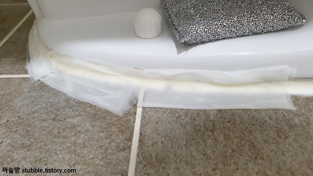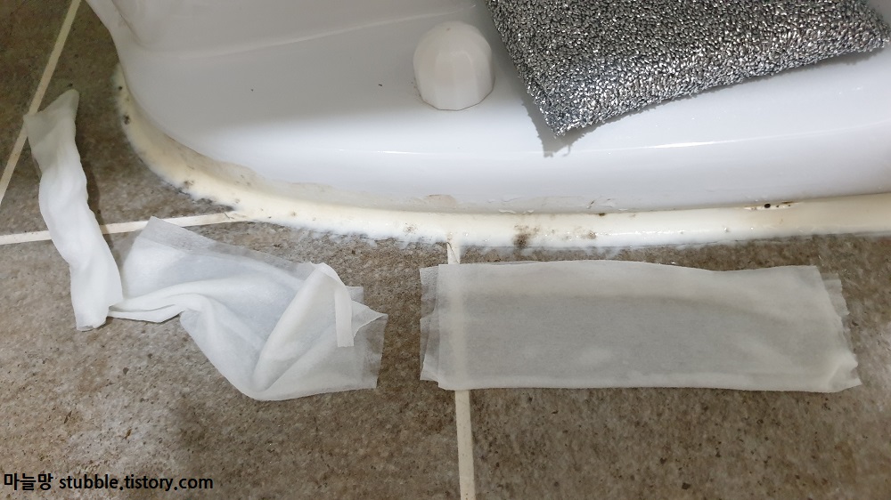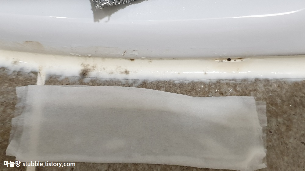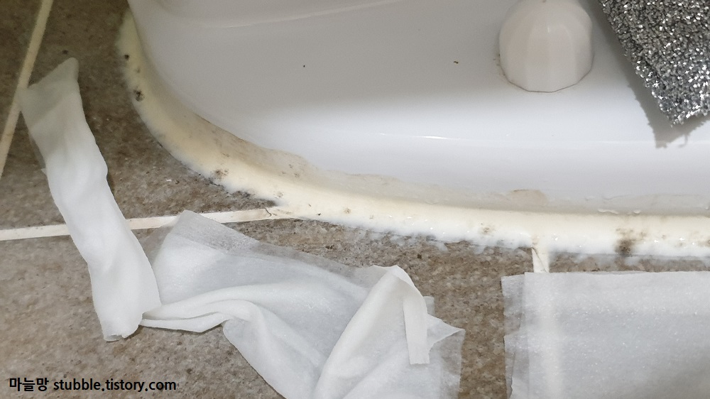 검정 곰팡이가 가득한 실리콘을 물티슈로 가리니깐 왠지 깔끔해 보이는 효과가 있었어요. 실리콘이 마치 마스크 팩을 한 것처럼 보입니다.
